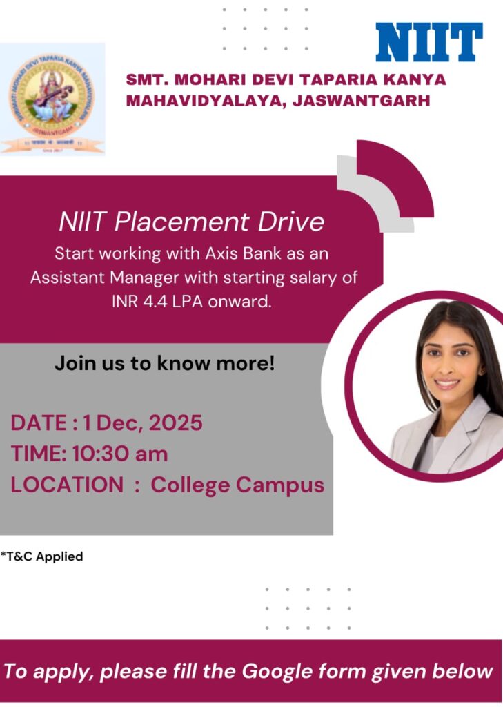 My warm greetings to the entire community of the Smt. Mohari Devi Taparia Kanya Mahavidyalaya. As I take up the responsibilities of the Principal of this exceptional institution, pride and hope fills my heart. As the best college of the Rajasthan, it established in the year 2018, it continued to fulfil its responsibility of enriching the nation with thinkers, entrepreneurs, writers, artists and teachers. I feel privileged and honoured to serve this College as the first woman Principal.